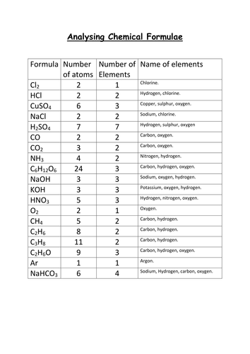 One or more digits representing that element's count may follow if the count is greater than 1. If a formula placed in parentheses, and a count (optionally added) is also a formula. If you are working on a spreadsheet with a lot of formulas in it, it may become challenging to comprehend how all those formulas relate to each other. The autosum formulas include the year at the top of each column in the calculation. This worksheet (with an optional companion video!) has students practice the skill of taking a chemical formula, and determining the elements int he formula, as well as the number of atoms of each. The molecular formula would have to be c4h10 as the number of hydrogen atoms cannot exceed 2+2x where x is the number of carbon atoms. Then multiply the number of atoms by the atomic number and you will have the number of protons in said mass. The chemical formula will give the number of atoms in one molecule, then multiply by avogadro's number (6.022 x 1023). Performs a vertical lookup by searching for a value in the first column of a table and returning the value in the same row in the index_number position. This 1 page editable worksheet with answer key contains questions to help students count the number of atoms found in a chemical formula. Atoms have very little mass so instead of using their actual masses in kilograms, their relative atomic masses are used. You use the periodic table to look up the mass of each atom. Notice atoms never gets written until the end.